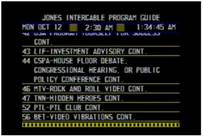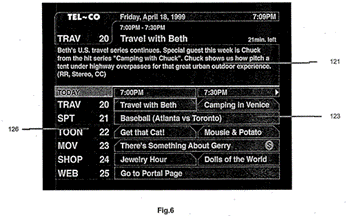 124. L’image ci-dessous représente à gauche un guide primitif déroulant des émissions diffusées que Jones Intercable de Napierville (Illinois) proposait à la fin des années 1980. L’image à droite représente le Prevue Guide des années 1990, un guide à peine plus sophistiqué dont les fonctionnalités étaient très limitées :