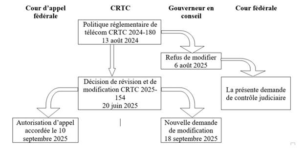 [10] Le 18 septembre 2025, les demanderesses, de concert avec SaskTel, ont présenté une nouvelle demande au gouverneur en conseil, cette fois pour que ce dernier annule ou modifie la décision de révision et de modification du CRTC. Dans leur demande, les demanderesses allèguent que la politique du CRTC est fondamentalement viciée, anticoncurrentielle et incompatible avec d’autres éléments de la politique canadienne de télécommunication. De plus, les demanderesses ont déposé une nouvelle preuve, à savoir un rapport d’expert sur l’incidence de la nouvelle politique sur la concurrence au sein de l’industrie des services Internet. Le gouverneur en conseil n’a pas encore rendu sa décision au sujet de cette deuxième demande.
