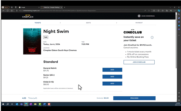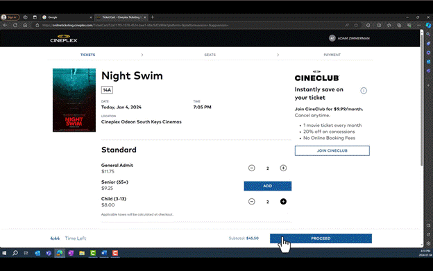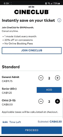 [10] On June 15, 2022, Cineplex implemented an Online Booking Fee as a service fee that applies only to tickets purchased on Cineplex’s website or app. Generally, the fee was fixed at $1.50 per ticket, to a maximum of four tickets, with no fee being payable for additional tickets if more than four tickets are purchased in one transaction. In addition, no fee is charged for members of Cineplex’s CineClub, which is Cineplex’s movie subscription program, and members of the Scene+ loyalty program are charged a reduced Online Booking Fee of $1.00 per ticket.